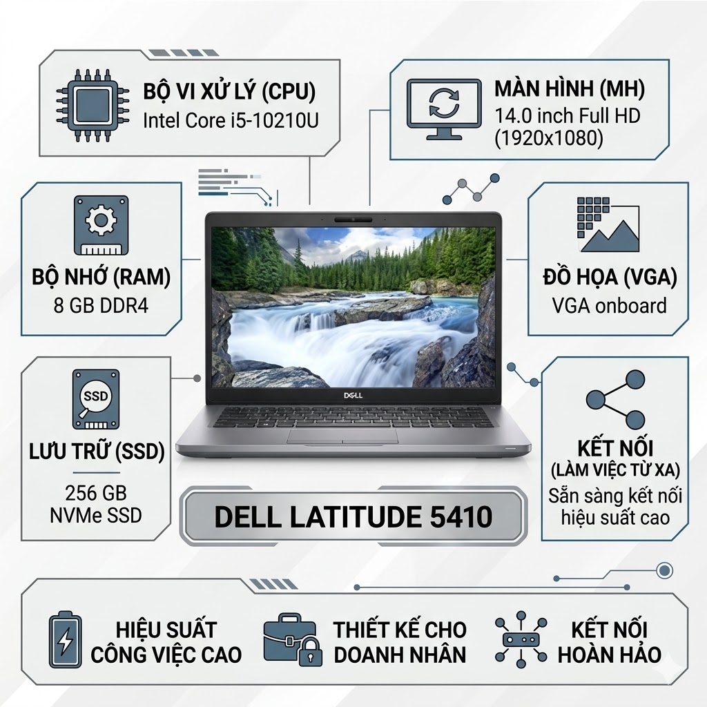 Dell Latitude 5410 là dòng laptop doanh nghiệp nổi tiếng với độ bền cao, hiệu năng ổn định và thiết kế gọn nhẹ. Sở hữu vi xử lý Intel Core i5-10210U, RAM 8GB cùng SSD NVMe tốc độ cao, sản phẩm đáp ứng tốt các nhu cầu làm việc văn phòng, học tập và giải trí cơ bản.