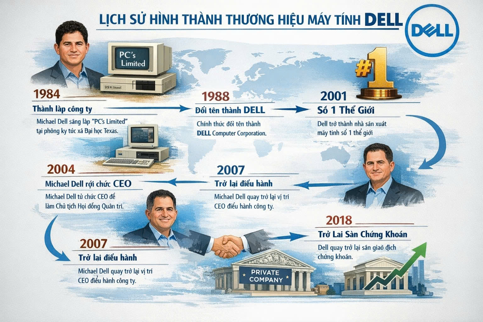Thương hiệu Dell được thành lập năm 1984 bởi Michael Dell tại Texas, Hoa Kỳ. Ban đầu công ty có tên là PC’s Limited, hoạt động với mô hình kinh doanh trực tiếp đến khách hàng – một chiến lược đột phá vào thời điểm đó.